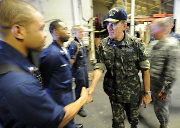 Keywords: Haiti Relief DVIDS259697.jpg en Brazilian army Maj Gen Floriano Peixoto Vieira Neto right force commander of the U N Stabilization Mission in Haiti meets with Sailors aboard the amphibious assault ship USS Bataan Bataan is supporting Operation Unified Response after a 7 0 magnitude earthquake caused severe damage in and around Port-au-Prince Jan 12 2010-03-11 https //www dvidshub net/image/259697 100311-N-+++++-011 2010-03-13 16 24 PORT-AU-PRINCE HT PD-USGov-Military-Navy Operation Unified Response Images from DoD uploaded by Fæ Floriano Peixoto Vieira Neto |