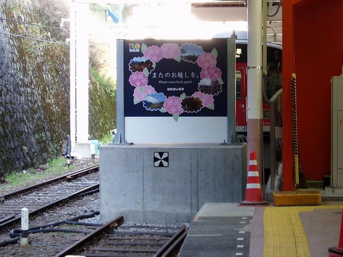 Keywords: Hakone-yumoto Platform 3 end.jpg en End sign at Hakone-Yumot Sta ã Platform No 3 Hakone Tozan Railway Hakone-Yumoto Station