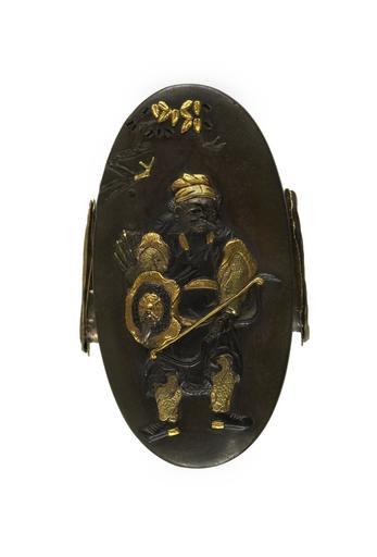 Keywords: Hamano Noriyuki - Kashira with a Chinese Archer - Walters 51943.jpg Walters Art Museum artwork Creator Hamano Noriyuki A Chinese warrior is shown standing beneath a tree branch He holds a shield in his right hand and a bow on his left Arrows are in a quiver on his back This is part of a set with Walters 51 942 between 1793 1852 Edo shibuichi gold cm 3 3 accession number 51 943 23755 William T / Henry Walters Collection Baltimore date and mode of acquisition unknown Walters Art Museum Henry Walters Acquired by William T or Henry Walters none place of origin Edo present-day Tokyo Japan Walters Art Museum license Kashira in the Walters Art Museum Hamano Noriyuki Media contributed by the Walters Art Museum needs category review Hamano Noriyuki II |