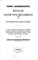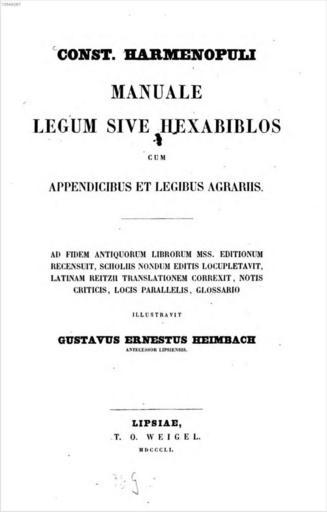 Keywords: Hexabiblos - Constantine Harmenopoulos - 1851 - Leipzing.png en Front page of the Procheiron or Hexabiblos of Constantine Harmenopoulos 1320 - 1380/1385 Leipzing 1851 edition by Gustav Ernst Heimbach Latin translation from Byzantine Greek Hexabiblos was a Byzantine legal treatise of the 14th century that continued to be widely used in the Balkan lands throughout the later Ottoman Empire's presence At 1828 it was adopted by the newly founded Greek state as the state's civic code where it remained so until 1946 el Η αρχική σελίδα της του Προχείρου ή Εξάβιβλου του Κωνσταντίνου Αρμενό ουλου 1320 - 1380/1385 έκδοση του 1851 στην Λειψία α ό τον Γκούσταβ Ερνστ Χάιεμ αχ μετάφραση στα λατινικά Η Εξάβιβλος ήταν μια Βυζαντινή νομική ραγματεία η ο οία συνέχισε να χρησιμο οιείται ευρέως στα Βαλκάνια κατά τη διάρκεια της μετέ ειτα Οθωμανικής αυτοκρατορίας Το 1828 το έργο αυτό υιοθετήθηκε ως ο νομικός κώδικας του νεοιδρυθέντος Ελληνικού κράτους ό ου και αρέμεινε σε ισχύ ως το 1946 1851 http //reader digitale-sammlungen de/de/fs1/object/display/bsb10566287_00011 html zoom 0 7000000000000002 Constantine Harmenopoulos original Gustav Ernst Heimbach editor other versions Custom license marker 2015 02 15 PD-old-70-1923 Uploaded with UploadWizard Byzantine writers Law books Books in Latin |