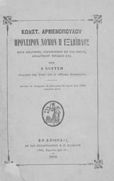 Keywords: Hexabiblos - Constantine Harmenopoulos - 1872 - Athina - first page.jpg en Front page of the Procheiron or Hexabiblos of Constantine Harmenopoulos 1320 - 1380/1385 Athens 1872 edition by Z Noutsis modern Greek translation Hexabiblos was a Byzantine legal treatise of the 14th century that continued to be widely used in the Balkan lands throughout the later Ottoman Empire's presence At 1828 it was adopted by the newly founded Greek state as the state's civic code where it remained so until 1946 el Η αρχική σελίδα της του Προχείρου ή Εξάβιβλου του Κωνσταντίνου Αρμενό ουλου 1320 - 1380/1385 έκδοση του 1872 στην Αθήνα α ό τον Ζ ούτση μετάφραση στα νέα ελληνικά Η Εξάβιβλος ήταν μια Βυζαντινή νομική ραγματεία η ο οία συνέχισε να χρησιμο οιείται ευρέως στα Βαλκάνια κατά τη διάρκεια της μετέ ειτα Οθωμανικής αυτοκρατορίας Το 1828 το έργο αυτό υιοθετήθηκε ως ο νομικός κώδικας του νεοιδρυθέντος Ελληνικού κράτους ό ου και αρέμεινε σε ισχύ ως το 1946 1872 http //anemi lib uoc gr/search/ search_type simple display_mode overview stored_cclquery creator 28 CE 91 CF 81 CE BC CE B5 CE BD CF 8C CF 80 CE BF CF 85 CE BB CE BF CF 82 20 CE 9A CF 89 CE BD CF 83 CF 84 CE B1 CE BD CF 84 CE AF CE BD CE BF CF 82 29 rss 0 number 10 keep_number 10 offset 1 Constantine Harmenopoulos original Z Noutsis translator/editor other versions Athens Greece Custom license marker 2015 02 14 PD-old-70-1923 Byzantine writers Law books Books in Greek Uploaded with UploadWizard |