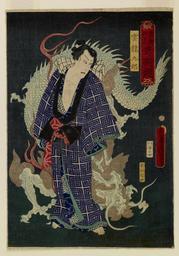 Keywords: Hiranoya Shinzo - Toyokuni kigo kijutsu kurabe - Walters 95131.jpg The actor Kawarazaki Gonjūrō I in the role of Unryū Kurō The monk Kurodo Tokugo wanted to get back at the people who ridiculed him because of his big nose but his scheme failed He posted a notice saying a dragon would rise out of Sarusawa pond on a certain day When he went to the pond he meant to ridicule everyone who would believe something so absurd But instead he got caught up in the excitement of those who were awaiting the dragon and forgetting his own made-up story he joined in the chanting of Buddhist prayers Although--according to the story--no dragon ever appeared in this print a grinning dragon spirit materializes behind the monk as he frantically makes magic gestures 1862-11 late Edo pigments mulberry paper cm 35 25 5 accession number 95 131 24746 Justine Lewis Keidel date and mode of acquisition unknown Walters Art Museum Gift of Justine Lewis Keidel 1986 Signature Ki-ō Toyokuni hitsu; Translation By the brush of the old man Toyokuni place of origin Japan 006-3828 Walters Art Museum license 2D Japanese prints in the Walters Art Museum Historic samurai prints Media contributed by the Walters Art Museum needs category review Utagawa Kunisada |