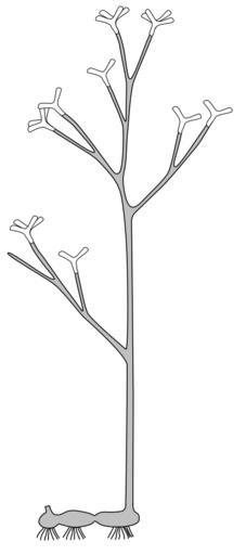 Keywords: Horneophyton.svg en Sketch of reconstruction of Horneophyton redrawn from http //www abdn ac uk/rhynie/horneo htm In the second version the size of the 'corms' has been reduced to match the size of the cross-section in the figure at the original source ~6mm ; the drawing after Eggert 1974 appears to exaggerate their size See also http //www chertnews de/errors html sizes own Peter coxhead 2011-03-18 first version 2011-01-28 Cc-zero Illustrations of plant fossils Horneophyton |