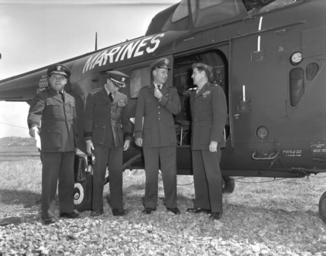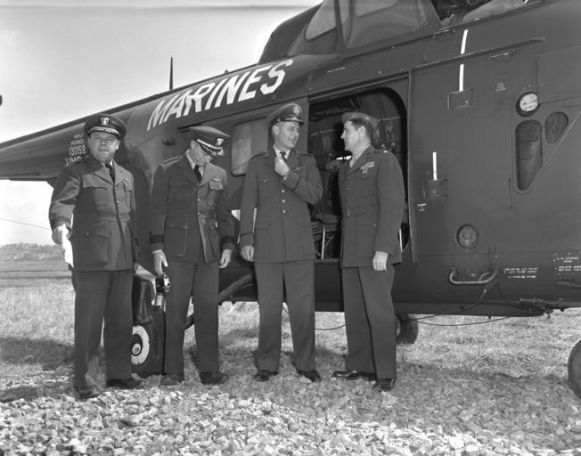 Keywords: HRS-2 HMR-161 w truce deleg 6Apr53.jpeg en A U S Marine Corps Sikorsky HRS-2 helicopter BuNo 130159 from Marine transport squadron HMR-161 provided air transportation for members of the United Nations truce talks during the Korean War delegation who were left to right Commander James E Shew United States Navy; Commander James A Masterson United States Navy; Colonel D M Cairns Unites States Air Force; and Marine Lieutenant Colonel Leo J Dulacki U S www defenseimagery mil phot no HM-SN-98-06904 JPEG/127-GK-234L-A170773 photographer TSgt Joseph Shkymba 1953-04-06 PD-USGov Sikorsky H-19 United States Marine Corps Korean War United States helicopters United States Marine Corps in the Korean War Marine Medium Tiltrotor Squadron 161 |