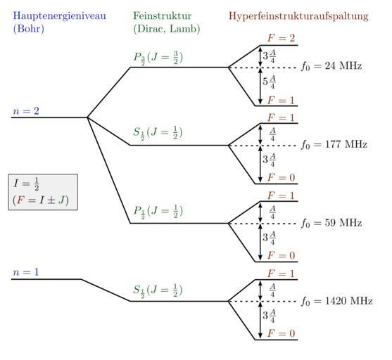 Keywords: Hydrogen-Fine-Hyperfine-Levels.svg de Fein- und Hyperfeinstruktur des Wasserstoffatoms mit den resultierenden Strahlungsfrequenzen Quellen http //www chemgapedia de/vsengine/vlu/vsc/de/ch/13/vlu/analytik/aas/hyperfeinstruktur vlu/Page/vsc/de/ch/13/pc/analytik/aas/aas4_hfs3a1 vscml html Image Fine_hyperfine_levels png en Fine and hyperfine levels of the hydrogen atom with the resulting radiation frequencies German version Own Tiltec 2009-01-18 made using Inkscape and TexText Hydrogen physics |