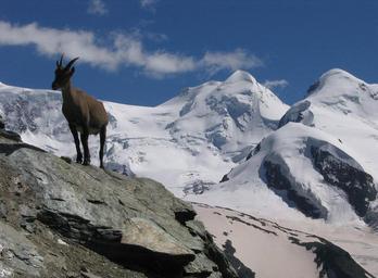 Keywords: Ibex.jpg en Alpine ibex and the summits of Castor and Pollux near Zermatt Own Earth explorer 2007-08-05 Capra ibex Mammals of Switzerland Castor and Pollux peaks Snow in Switzerland