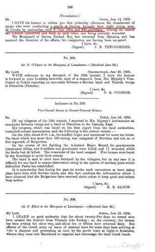 Keywords: Τηλεγράφημα του πρόξενου της Βρετανίας με την είδηση της σύλληψης ομάδας Μακεδονομάχων στη Δοβίστα, β μέρος.GIF el Τηλεγράφημα του ροξένου της Βρετανίας στις Σέρρες Ι Θεοδωρίδη ρος τον Γενικό Πρόξενο της Βρετανίας στη Θεσσαλονίκη με το ο οίο τον ληροφορεί για τη σύλληψη ομάδας ακεδονομάχων στη Δοβίστα α ό α όσ ασμα του οθωμανικού στρατού στις 13 Ιουνίου 1905 β μέρος en Telegram of the British vice-consul in Serres I Theodorides to the General Consul in Salonica R Graves containing the news of the arrest of a Greek band of Makedonomakhoi Macedonian-fighters by Ottoman troops at Dovista on June 13 1905 part b 1906 Parliamentary papers 1850-1908 volume 137 Great Britain Parliament House of Commons other versions PD-old-70-1923 Uploaded with UploadWizard Uncategorized 2015 July 15 |