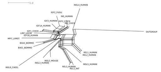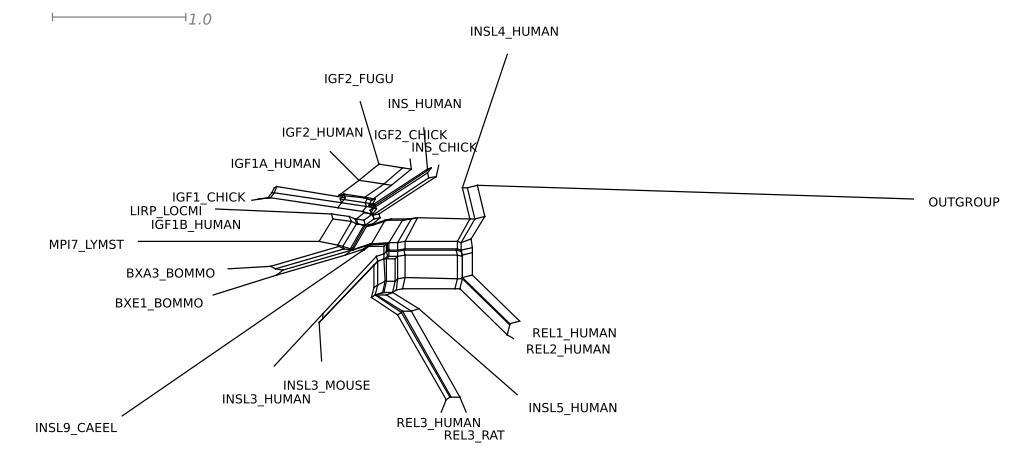 Keywords: Insulin-like tree.svg en Phylogenetic tree actually a split network equal-angle with equal-daylight and box-opening using Muscle-aligned data from UniProt cite journal Edgar RC MUSCLE multiple sequence alignment with high accuracy and high throughput Nucleic Acids Res 32 5 1792 “7 2004 15034147 390337 10 1093/nar/gkh340 cite journal Huson DH Bryant D Application of phylogenetic networks in evolutionary studies Mol Biol Evol 23 2 254 “67 2006 February 16221896 10 1093/molbev/msj030 http //mbe oxfordjournals org/cgi/reprint/msj030 ijkey GvcBFw4QPIORzUE keytype ref pdf Own Ayacop 2009-12-22 Insulin-like Split networks |