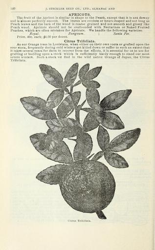 Keywords: J. Steckler Seed Co., Ltd. garden manual 1900 (16571380381).jpg 140 <br> J STECKLER SEED CO I/TD ALMANAC AND <br> APRICOTS <br> The fruit of the Apricot is similar in shape to the Peach except that it is not downy <br> and is almost perfectly smooth The leaves are cordate or heart-shaped and not long as <br> Peach leaves and the bark of the wood is coarse grained and not smooth and glossy like <br> Peach wood Apricots should not be confounded with Nectarines or Naked Fruited <br> Peaches which are often mistaken for Apricats We handle the following varieties <br> Royal Bungoum \ Santa Fee <br> Price 40c each; 4 00 per dozen <br> Citrus Trifoliata <br> As our Orange trees in Louisiana when either on their own roots or grafted upon the- <br> sour stocfc frequently during cold winters get killed down or suffer to such an extent that <br> it takes several years for them to recover from the effects it is essential for us to use for <br> grafting or budding upon a stock w T hich is sufficiently hardy enough to stand our most <br> severe winters Such a stock we find in the wild native Orange of Japan the Citrus <br> Trifoliata <br> Citrus Trifoliata 43933694 150250 78709 Page 140 Text http //www biodiversitylibrary org/page/43933694 1900 10 5962/bhl title 78709 Henry G Gilbert Nursery and Seed Trade Catalog Collection ; J Steckler Seed Co NameFound Citrus NameConfirmed Citrus sp cv sannumphung EOLID 11916267 Biodiversity Heritage Library J Steckler Seed Co Ltd garden manual 1900 dealers in vegetable flower field and grass seeds Garden Stories Catalogs Flowers J Steckler Seed Co Seed industry and trade Seeds Trade catalogs Vegetables U S Department of Agriculture National Agricultural Library bhl page 43933694 dc identifier http //biodiversitylibrary org/page/43933694 bhlGardenStories Fruit Citrus BHLinbloom j steckler seed co u s department of agriculture national agricultural library bhlgardenstories bhlinbloom Information field Flickr posted date ISOdate 2015-02-18 CC-BY-2 0 BioDivLibrary https //flickr com/photos/61021753 N02/16571380381 2015-08-24 02 54 47 cc-by-2 0 PD-old-70-1923 Citrus J Steckler Seed Co Ltd garden manual 1900 Photos uploaded from Flickr by Fæ using a script |