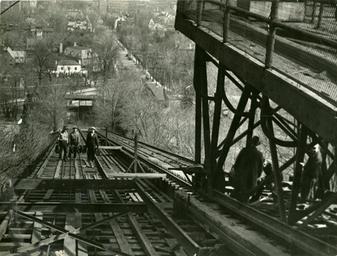 Keywords: Original Photographs Collection Caption: Landmark sold as scrap--The James street incline, erected about half a century ago, but not operated for the last several years, has been sold to the International Iron and Metal company, of this city, and workers started to dismantle it this morning. The Runnymede Iron and Steel company has contracted to tear down the incline for the new owners. In the photograph is shown a view from the incline platform on upper James street, while inset shows one of the cars. The incline car which is now against the upper James street platform will shortly start on its last trip down the rails. A derrick is to be mounted on the car, and the tracks and tressle will be torn up and loaded on the car as it is lowered further down the line toward the bottom of the Mountain. Hamilton Spectator Photograph, April 15, 1942. 32022201863921 Original Photographs Collection Caption: Landmark sold as scrap--The James street incline, erected about half a century ago, but not operated for the last several years, has been sold to the International Iron and Metal company, of this city, and workers started to dismantle it this morning. The Runnymede Iron and Steel company has contracted to tear down the incline for the new owners. In the photograph is shown a view from the incline platform on upper James street, while inset shows one of the cars. The incline car which is now against the upper James street platform will shortly start on its last trip down the rails. A derrick is to be mounted on the car, and the tracks and tressle will be torn up and loaded on the car as it is lowered further down the line toward the bottom of the Mountain. Hamilton Spectator Photograph, April 15, 1942. 32022201863921 |