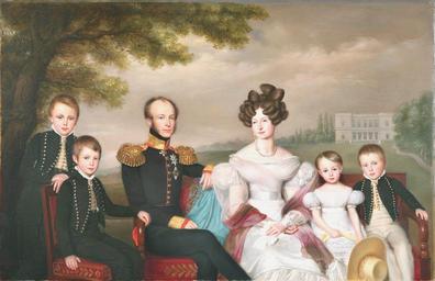 Keywords: Jan Baptist van der Hulst - Koning Willem II en familie.jpg King William II with his family From left to right Willem III 1817 “1890 Alexander 1818 “1848 Willem II 1792 “1849 Anna Paulovna 1795 “1865 Sophie 1824 “1897 and Hendrik 1820 “1879 1832 Oil on panel cm 46 70 Institution Royal Collections of the Netherlands http //www koninklijkhuis nl/foto-en-video/koninklijk-huisarchief/willem-ii-kunstkoning other versions PD-Art-old-100 DEFAULTSORT 1832; House of Orange-Nassau Jean-Baptiste Van der Hulst William II of the Netherlands Anna Pavlovna of Russia 1832 William III of the Netherlands Alexander Prince of Orange 1818 “1848 Prince Henry of the Netherlands Princess Sophie of the Netherlands House of Orange-Nassau Royal Collections of the Netherlands 1830s dresses 1832 portrait paintings M 19th-century family portraits of royalty 19th-century oil on panel paintings 19th-century oil portraits of sitting boys at three-quarter length 19th-century oil portraits of sitting men at three-quarter length in military uniforms 19th-century oil portraits of sitting women at three-quarter length 19th-century portrait paintings in the Netherlands 19th-century portraits in military uniforms Family portraits of Netherland rulers Females with white dresses in art Group portraits with 6 persons Portrait paintings of parents and children Portraits with shawls |