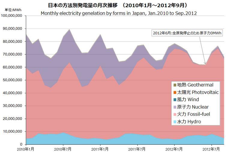 Keywords: Japan electricity by forms.png ja 経済産業 資源エネルギー庁 http //www enecho meti go jp/info/statistics/denryoku/result-2 htm 電力調査統計に基づく 日 国内の方法別発電量実績 2010年1 ~2012年9 の33ヶ 間 2012年11 27日時点 2012-11-27 own Pekachu cc-zero Uploaded with UploadWizard Electric power companies of Japan Energy in Japan 2011 Tōhoku earthquake damage |