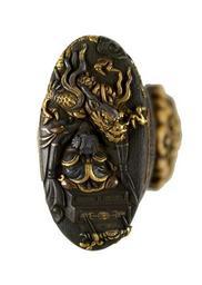 Keywords: Japanese - Tsuka with Emperor, Dragon and Tiger - Walters 5112323B - Detail A.jpg The seated figure in a cart on the kashira might be the Chinese general Gentoku Ch Liu Bei Liu Pei He was an important figure in the 2nd century and his story is part of the legend The Romance of the Three Kingdoms Gentoku eventually became emperor of Shu Shu A dragon appears over his cart to protect him The menuki are in the shape of a dragon and a tiger These two animals are commonly paired as a symbol of a ruler and his advisers This is part of a mounted set century 19 Edo-Meij wood ivory gold sentoku copper cm 10 5 accession number 51 1232 3B 79635 Henry Walters Baltimore date and mode of acquistion unknown Walters Art Museum Henry Walters Acquired by Henry Walters none place of origin Japan Walters Art Museum license Tsuka in the Walters Art Museum Media contributed by the Walters Art Museum needs category review |