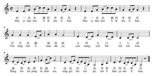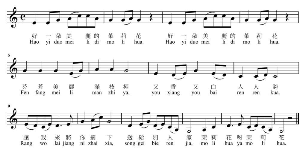 Keywords: Jasmine barrow.svg en This is the melody and lyrics in Chinese and Hanyu Pinyin of the Chinese folk song 茉莉花 Mòlìhuā Jasmine The melody is according to John Barrow but regulated to C major own Asoer 2011-03-21 PD-old Sheet music from China Folk songs |