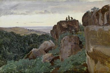 Keywords: Jean-Baptiste Camille Corot - Marino - trois personnages au sommet des rochers.jpg Artwork Creator Jean-Baptiste Camille Corot oil canvas cm 23 34 object history PROVENANCE Sale Posthume Corot no 290 110F to Chamouillet<br/>Private collection UK credit line bears studio stamp lower right ; with Vente Corot seal on the reverse accession number http //www bonhams com/auctions/19923/lot/11/ Bonhams PD-Art-100 Landscape paintings of Italy by Jean-Baptiste-Camille Corot Mountains in art Images from Bonhams Climbing in art Marino Lazio in art |