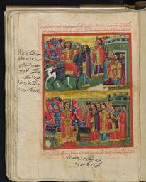 Keywords: Jews Byzantine Greek Alexander Manuscript.JPG en A fourteenth-century miniature Greek manuscript depicting scenes from the life of Alexander the Great The priests of the Jews Rabbis offer Alexander the Great Gold and Silver Alexander spent the gifts of the Rabbi s on his Gods The whole scene is depicted entirely in Byzantine fashion of the late Byzantine period 1204-1453 Alexander the Great is depicted as a Byzantine Emperor Basileus and his troops are depicted as Byzantine-Greek soldiers of the 14th century The Jewish Rabbis are shown wearing distinctive ceremonial robes and small caps on their heads Originally written in Byzantine Greek script additional Arabic script in Turkish Language was added centuries later From the Alexander Romance in S Giorgio dei Greci in Venice he היהודי רבני היווני ש המאה הי ד el Οι ιερείς των Ιουδαίων ροσφέρουν στον Αλέξανδρο χρυσό και άργυρο Ο Αλέξανδρος αφιερώνει τα δώρα των ιερέων στους θεούς του image http //194 177 217 107/gr/showpic asp picpath 9999_min_01_92v curtable miniatures currecord 111 vorder 1 vmode miniat Miniature of the Alexander Romance a fourteenth-century book<br/> Website http //www istitutoellenico org/english/pubblicazioni/index5 html Hellenic Institute of Byzantine and Post-Byzantine Studies in Venice<br/> anonymous 1204-1453 <gallery>File Jews Byzantine Greek Alexander Manuscript cropped JPG</gallery> PD-old-100 Byzantine dress Rabbis in art Medieval miniatures of Jews Medieval European Jewish clothing Byzantine Alexander Romance Venice |