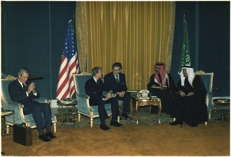 Keywords: Jimmy Carter and Cyrus Vance meet with Crown Prince Fahd and King Khalid of Saudi Arabia. - NARA - 177434.tif Scope and content General notes 177434 Local identifier President 1977-1981 Carter White House Staff Photographers 01/20/1977 - 01/20/1981 Jimmy Carter Library NLJC 441 Freedom Parkway Atlanta GA 30307-1498 1978-01-03 Record group Collection JC-WHSP Carter White House Photographs Collection 01/20/1977 - 01/22/1981 Record group ARC 1120 Carter White House Photographs Presidential compiled 01/20/1977 - 01/22/1981 Series ARC 173341 File unit President and Mrs Carters trip -- Riyadh Saudi Arabia 01/03/1978 - 01/03/1978 File unit ARC 177433 Variant control numbers NAIL Control Number NLC-WHSP-C-03865-18A yes Other versions NARA-cooperation PD-USGov Fahd of Saudi Arabia Jimmy Carter with national leaders Relations of Saudi Arabia and the United States Cyrus Vance King Khalid bin Abdulaziz |