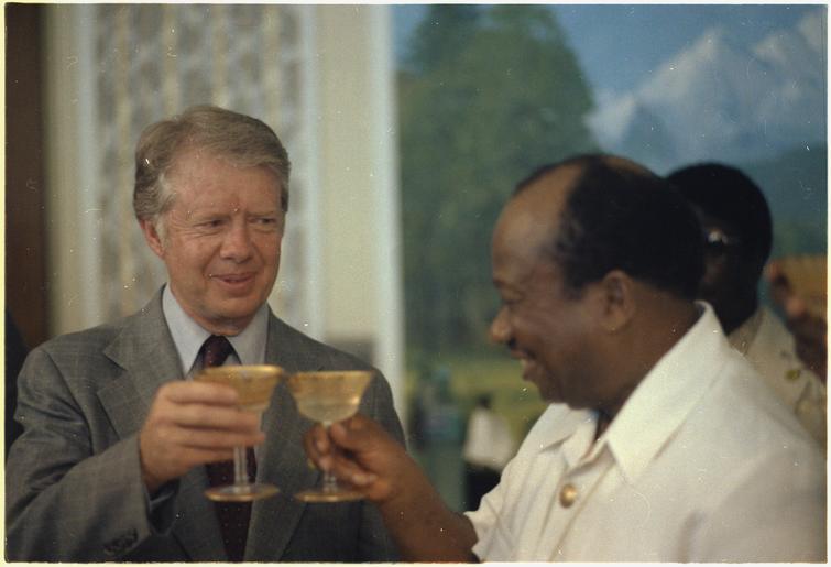 Keywords: Jimmy Carter and President William Tolbert of Liberia engage in a toast during a state dinner in honor of Jimmy... - NARA - 178727.tif Scope and content General notes 178727 Local identifier President 1977-1981 Carter White House Staff Photographers 01/20/1977 - 01/20/1981 Jimmy Carter Library NLJC 441 Freedom Parkway Atlanta GA 30307-1498 1978-04-03 Record group Collection JC-WHSP Carter White House Photographs Collection 01/20/1977 - 01/22/1981 Record group ARC 1120 Carter White House Photographs Presidential compiled 01/20/1977 - 01/22/1981 Series ARC 173341 File unit Jimmy Carter Amy Carter - Monrovia Liberia 04/03/1978 - 04/03/1978 File unit ARC 178726 Variant control numbers NAIL Control Number NLC-WHSP-C-05056-14 yes Other versions NARA-cooperation PD-USGov William Tolbert |