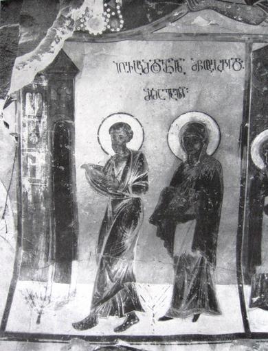 Keywords: Joachim and Anna. Bertubani fresco.jpg en Joachim and Anna A fresco from Bertubani century 13 ამირა აშვილი შ ქართული ხელ ვ ების ისტ რია Tbilisi 1971 author PD-Art Bertubani monastery Frescos in Georgia Georgia in the 13th century Saint Joachim Saint Anne Asomtavruli frescos |