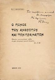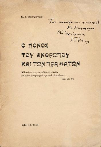 Keywords: K-karyotakis-ponos-anthropon-1919.jpg en Kostas Karyotakis O ponos tou anthropou kai ton pramaton The pain of man and things first edition in 120 copies Athens Greece 1919 In Greek Front cover with author's handwritten dedication to the strange poet M Damirales el Κώστας Καρυωτάκης Ὁ όνος τοῦ νθρώ ου καὶ τῶν ραμάτων Πρώτη έκδοση σε 120 αντίτυ α Αθήνα 1919 Εξώφυλλο με ιδιόχειρη αφιέρωση του Κ Κ στον « αράξενο οιητή» Δαμιράλη 1919 www vergosauctions com Kostas Karyotakis 1896-1928 other versions PD-old-70-1923 Kostas Karyotakis Book covers from Greece |