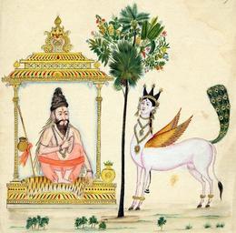 Keywords: Kamadhenu parijata.jpg en Painting of a rishi the Parijata Tree and Kamadhenu The sage sits in an architectural frame seated on a tiger-skin and with yogabandha In his right hand he holds a rosary To his rigth are his water-pot and staff while to his left is a lotah with bilva leaves In the centre of the page is the Parijata Tree with many different types of leaves and flowers To the left is the wish-fulfiling mythic beast Kamadhenu or Surabhi It has a human crowned head the body of a cow with anklets as well as wings and a peacock's tail An element of perspective is provided by the sketched in foreground On laid European paper watermarked with an armorial design and 'T W' http //www britishmuseum org/research/search_the_collection_database/search_object_details aspx objectid 3081171 partid 1 output Places 2f 2fOR 2f 2f41119 2f 2f41119-2-20 2f 2fPainted+in+South+India 2f 2f 2f 2f 2f 2f orig 2fresearch 2fsearch_the_collection_database 2fadvanced_search aspx currentPage 5 numpages 10 Author ca 1820 PD-art Kamadhenu Tiger fur-skins in art Parijat