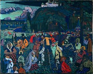 Keywords: Kandinsky, La vie mélangée.jpg fr La vie mélangée de Kandinsy dépôt de la Bayerishe Landesbank à la Städtische Galerie im Lenbachhaus Munich Dans cette toile empreinte de nostalgie peinte à Sèvres il y représente notamment son chat Vaska Kandinski recourt à la perspective aérienne afin de pouvoir entasser tous ses personnages Il évoque le passé lointain où se côtoient des figures de la vieille Russie de la babouchka au petit enfant en passant part le mendiant du pèlerin au moine du couple amoureux dans l'herbe au rameur des figures saintes mère portant son enfant modèle de l'Oumilénie Vierge de Tendresse saints Boris et Gleb cavalier représentant saint Georges église en bois ou tirées des contes citadelle du Kremlin dominant la colline qui a une isba sur son flanc 1907 http //www lenbachhaus de/sammlung/der-blaue-reiter/fruehe-bilder/ Creator Wassily Kandinsky other versions Custom license marker 2016 01 06 PD-old Paintings by Wassily Kandinsky Uploaded with UploadWizard Paintings in the Lenbachhaus |