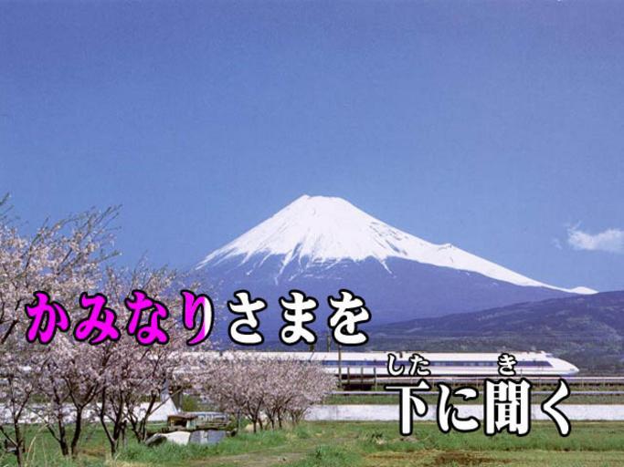 Keywords: Karaoke subtitle.jpg Example of Karaoke subtitle lyrics ja ふじの山 an old Japanese song Background Picture Image Mountfujijapan jpg Public Domain <br /> Subtitle Created by Kkkdc 13 00 27 July 2007 UTC Swollib Kkkdc Karaoke Japanese writing Subtitles Tōkaidō Shinkansen with Mount Fuji Unidentified Mount Fuji Songs of Japan Pink with white in Japan Furigana hiragana |