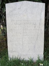 Keywords: KawaiahaoChurchcemetery-Salai-hiwauli.JPG en Grave marker of Salai Hiwauli wife of John K Ii in Kawaiaha ˜o Church cemetery Honolulu Hawaii Engraved in Hawaiian He mea hoomanao ia in memory of / SALAI HIWAULI / wahine a Ioane Ii wife of John Ii / Make i Nawiliwili Kauai died at / Aug 29 1856 / Hanau i Kahaluu Oahu born at / Sept 14 1804 / Kona mau Makahiki a pau her age at death / 51 mak 11 mal 15 la 51 yr makahiki 11 mo malama 15 days la / 1 KOR 15 57 E hoomaikaiia hoi ke Akua ka mea nana i haawi mai ia kakou ka lanakila ma ko kakou Haku ma o Iesu Kristo la quoting 1839 Baibala Hemolele; in 2012 spelling E hoÊ»omaikaÊ»i Ê»ia hoÊ»i ke Akua ka mea nÄna i hÄÊ»awi mai iÄ kÄkou ka lanakila ma ko kÄkou Haku ma o IesÅ« Kristo lÄ ; in English RSV But thanks be to God He gives us the victory through our Lord Jesus Christ 2014-06-15 16 57 11 own Joel Bradshaw cc-zero Uploaded with UploadWizard KawaiahaÊ»o Church John Papa ʻĪʻī Cemeteries in Hawaii |