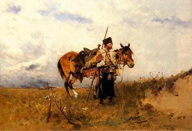 Keywords: Kozak na stanowisku.jpg Artwork Creator Józef Brandt Cossack on duty Probably set in the 16th-17th century oil canvas cm 26 37 5 object history credit line signed Jozef Brandt / Warszawy lower right accession number unknown 200px PD-old-auto 1915 Zaporozhian Cossacks by Józef Brandt History of cavalry through painting Paintings of men with horses Paintings of Cossacks