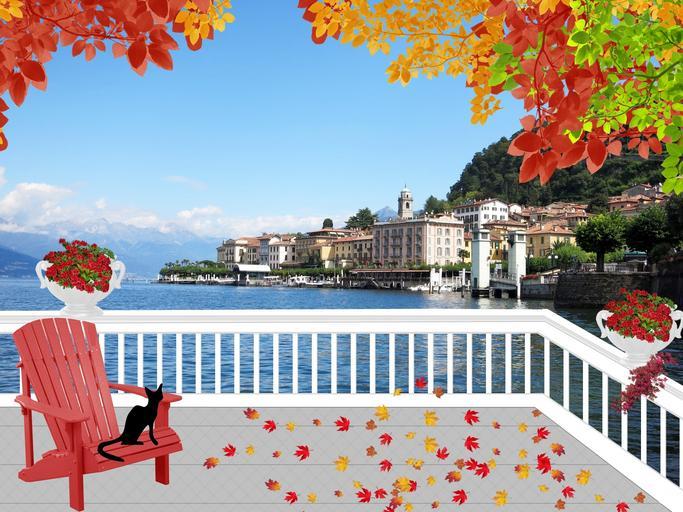 Keywords: landscape lake italy lake como patio leaves fall adirondack chair flowers jardiniere balustrade black cat