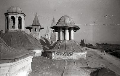 Keywords: salt araştırma saltaraştırma salt research saltresearch salt online saltonline aydınlık feneri aydınlıkfeneri lantern lighting tower lanternlightingtower çatı kubbe geleneksel yapı teknikleri gelenekselyapıteknikleri roof dome traditional building techniques traditionalbuildingtechniques mimari architecture çoban mustafa paşa çobanmustafapaşa çoban mustafa paşa külliyesi çobanmustafapaşakülliyesi gebze blackandwhite monochrome black and white Lantern lighting towers are building components installed in the middle of roofs or domes to provide light to the interior. They comprise many small windows and are usually polygonal in plan. The component became fairly common in Europe after the Renaissance, and is often seen in Seljuk and early Ottoman buildings. With the improvement of construction techniques, lanterns were replaced with tabouret windows and circular light shafts in classical Ottoman architecture and were only used for a longer period in civil buildings like inns, caravansaries and houses. SALT Research, Ali Saim Ülgen Archive Aydınlık fenerleri, örtülü iç mekânlara ışık sağlamak üzere çoğunlukla kubbe ya da çatının ortasında yer alan, çevresi pencereli bölümlerdir. Geleneksel tekniklerle inşa edilmiş kütlesel yapılarda pencere azlığından doğan aydınlanma gereksinimi, genellikle kare ya da çokgen planlı olan aydınlık fenerleriyle giderilir. Rönesans’tan sonra Avrupa’da yaygınlık kazanan yapı elemanı, Selçuklu ve erken dönem Osmanlı yapılarında sıkça görülür. Yapı tekniğinin gelişmesiyle Klasik Osmanlı Mimarlığı dönemi cami ve hamamlarında yerini kasnak pencereleri ya da filgözü ışıklıklara bırakmış; han, kervansaray, konut ve benzeri sivil mimari örneklerinde ise bir süre daha kullanılmıştır. SALT Araştırma, Ali Saim Ülgen Arşivi Lantern lighting towers are building components installed in the middle of roofs or domes to provide light to the interior. They comprise many small windows and are usually polygonal in plan. The component became fairly common in Europe after the Renaissance, and is often seen in Seljuk and early Ottoman buildings. With the improvement of construction techniques, lanterns were replaced with tabouret windows and circular light shafts in classical Ottoman architecture and were only used for a longer period in civil buildings like inns, caravansaries and houses. SALT Research, Ali Saim Ülgen Archive Aydınlık fenerleri, örtülü iç mekânlara ışık sağlamak üzere çoğunlukla kubbe ya da çatının ortasında yer alan, çevresi pencereli bölümlerdir. Geleneksel tekniklerle inşa edilmiş kütlesel yapılarda pencere azlığından doğan aydınlanma gereksinimi, genellikle kare ya da çokgen planlı olan aydınlık fenerleriyle giderilir. Rönesans’tan sonra Avrupa’da yaygınlık kazanan yapı elemanı, Selçuklu ve erken dönem Osmanlı yapılarında sıkça görülür. Yapı tekniğinin gelişmesiyle Klasik Osmanlı Mimarlığı dönemi cami ve hamamlarında yerini kasnak pencereleri ya da filgözü ışıklıklara bırakmış; han, kervansaray, konut ve benzeri sivil mimari örneklerinde ise bir süre daha kullanılmıştır. SALT Araştırma, Ali Saim Ülgen Arşivi |