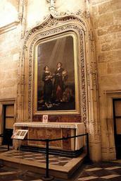 Keywords: Las santas Justa y Rufina, de Francisco de Goya. (Sacristía de los Cálices de la catedral de Sevilla).JPG El cabildo catedralicio sevillano le encargó este cuadro a Goya en 1817 y por mediación de Agustín Ceán Bermúdez que era un erudito y escritor de arte y amigo personal de Goya El cuadro estaba destinado al altar de la Sacristía de los Cálices de la catedral de Sevilla España donde aún permanece Y conviene señalar que las santas alfareras Justa y Rufina que son las patronas de Sevilla fueron martirizadas por haberse negado a adorar una imagen de la diosa Venus y siempre suelen ser representadas junto a objetos de barro como símbolo de su profesión y con las palmas del martirio En esta obra un león lame mansamente el pie de Santa Rufina herido por haberla forzado a caminar desde la sierra hasta Sevilla y esta ciudad aparece al fondo destacándose la Torre de la Giralda de la catedral sevillana que según la tradición quedó en pie por la intervención milagrosa de estas mártires durante el terremoto que asoló Sevilla en 1504 1817 oil canvas Size cm 177 309 Institution Catedral de Santa María de la Sede de Sevilla Sacristía de los Cálices de la catedral de Sevilla https //www museodelprado es/coleccion/galeria-on-line/galeria-on-line/obra/santa-justa-y-santa-rufina/ object history exhibition history credit line accession number own PD-old-100 cc-by-sa-4 0 Santas Justa y Rufina Francisco de Goya |