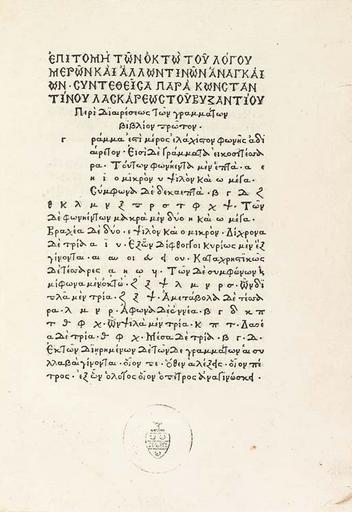 Keywords: Lascaris-epitome-1476.jpg en A page from Constantine Lascaris' Epitome sometimes called Erotemata the first book print entirely in Greek Dated 30 January 1476 The characters font were designed by Demetrios Damilas The book was printed in Milan by Dionisio de Parravisino The book made later several other editions Dimensions 23cm x 16cm 76 leaves el Σελίδα α ό την Ἐ ιτομὴ τῶν κτῶ τοῦ λόγου μερῶν του Κωνσταντίνου Λάσκαρι Λασκάρεως το ρώτο βιβλίο ου τυ ώθηκε εξ ολοκλήρου στα ελληνικά Φέρει χρονολολόγηση 30 Ιανουαρίου 1476 Οι χαρακτήρες γραμματοσειρά σχεδιάστηκαν α ό τον Δημήτριο Δαμιλά Τυ ώθηκε στο ιλάνο α ό τον Dionisio de Parravisino Ε ανεκδόθηκε ολλές φορές αργότερα Διαστάσεις 23cm x 16cm 76 φύλλα 1476-01-30 http //www christies com/lotfinder/lot/lascaris-constantine-erotemata-in-greek-milan-1932394-details aspx from salesummary intObjectID 1932394 sid 01781b2b-798b-4af2-a666-d48967aa2ed0 Constantine Lascaris 1434 - 1501 other versions PD-old-100-1923 Uploaded with UploadWizard Books in Greek |