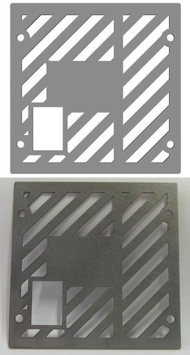 Keywords: Laser cutting CAD and physical part.png This picture shows top a CAD model of a metal part and bottom the manufactured part produced by laser cutting from 0 5mm thick stainless steel Ober CAD-Modell unt Unterhalb Laserschneiden stahl User Mike1024 2008-12-07 User Mike1024 Laser cutting Taken with Canon PowerShot A80 |