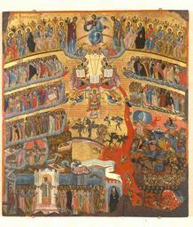 Keywords: Last Judgment by F.Kavertzas (1640-41).jpg Η Δευτέρα Παρουσία 1640-1641 124 5x38εκ Φραγκιάς Καβερτζάς ΧΕΙΡ ΦΡΑΓΓΙΑ ΚΑΒΕΡΤΖΑ ΔΕΗCΙC ΤΗC ΔΟΥΛΗC ΤΟΥ ΘΕΟΥ ΕΥΓΕ ΗΑC Ο ΑΧΗC ΤΗC ΤΡΑΠΕΖΟ ΤΙΟΠΟΥΛΑC Στην εικόνα αριστάνεται ο Χριστός ως Κριτής στο μέσον και ε άνω χαμηλότερα ο σταυρός και οι άγγελοι ου κρατούν βιβλία ή σαλ ίζουν και ο αρχάγγελος ιχαήλ με τη ζυγαριά των ψυχών και το σ αθί Πιο κάτω αριστάνεται ο ροφήτης Δανιήλ ξα λωμένος σε ένα σύννεφο και δί λα του ειλητό με κείμενο της Παλαιάς Διαθήκης ου αναφέρεται στο όραμά του για την έλευση του Υιού του Ανθρώ ου Στην αριστερή λευρά εικονίζονται οι δίκαιοι σε τρεις διαδοχικές σειρές και στη δεξιά τα έθνη ου εριμένουν να κριθούν Πιο κάτω δεξιά αριστάνεται η Κόλαση με τις α εικονίσεις της γης της θάλασσας του ουρανού τον βασανισμό των αμαρτωλών και το βύθιο δράκοντα ενώ αριστερά βρίσκεται ο Παράδεισος με τον Χριστό ως έγα αρχιερέα να υ οδέχεται τους δικαίους στην Πύλη του Παραδείσου Σε μία άλλη ύλη βρίσκεται η Παναγία και σε μία τρίτη η αφιερώτρια http //eib xanthi ilsp gr/gr/icons asp 1640 1641 Fragias Kavertzas PD-old Files uploaded by Shakko from various sources Icons of Last Judgment Cretan School 15th-century icons of Byzantine Empire 17th-century icons of Greece |