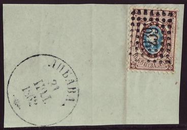 Keywords: Latvia Forerunner RuNo05 1862 Libau B002a.jpg Philatelic forerunner of Latvia; piece of cover with Latvia forerunner stamp from 1862;<br /> Stamp Russia definitive stamp from 1858; Michel No 5; Yvert Tellier No 5<br /> Color blue / brown<br /> Watermark none<br /> Nominal value 10 Kopeks<br /> Sender postmark Russian chest dotted postmark of the postal district 239 postal district Libawa Libau <br /> Postmark of transition or receiver post office Libawa other date 1862-07-31 Libau contemporary Liepāja Latvia scan of original other date 1862-07-31 date of postmark Postal administration of the Russian Empire PD-LV-exempt PD-RU-exempt stamps <gallery> File Russia 1858 Sc8u JPG The same stamp Russia No 5 from an other location </gallery> Philately Coats of Arms of the Russian Empire with Crown and Coronets Michel Russia No 5; Yvert Tellier Russia No 5 other date 1858-09-19 Postal administration of the Russian Empire lithographic prining 60 000 000 line perforation L 12 12½ Russland Nr 5 Stamps of Latvia Stamps of Russia 1858 Liepāja on stamps Postmarks of Latvia |