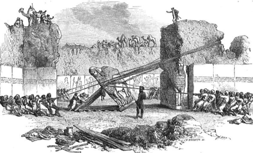 Keywords: Lowering of the bull.jpeg Frontispiece A popular account of discoveries at Nineveh Austen Henry Layard 1851 own User oncenawhile 2013-07-18 Pages https //archive org/stream/apopularaccount00layagoog/apopularaccount00layagoog_djvu txt 285-286 These circumstances induced me to undertake the removal of the larger sculptures as early as possible I determined to embark them for Busrah in the month of March or April foreseeing that as soon as the Bedouins had moved northwards from Babylonia and had commenced their plundering expeditions in the vicinity of Mosul I should be compelled to leave Nimroud Being loth however to abandon all these fine specimens of Assyrian sculpture I resolved upon attempting the removal and embarkation of two of the smallest and best preserved and fixed upon a lion and a bull from the great central hall Thirteen pairs of these gigantic sculptures and several fragments of others had been discovered ; but many of them were too much injured to be worth sending to England I had wished to secure the lions forming the great entrance to the principal chamber of the N W palace ; the finest specimens of Assyrian sculpture discovered in the ruins But after some deliberation I determined to leave them for the present; as from their size the expense attending their conveyance to the river would have been very considerable PD-old PD-US Uploaded from Mobile iOS 1 0 1 Assyria Shedu Austen Henry Layard |