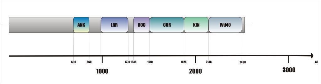 Keywords: Lrrk2 domains.jpg en domain structure of LRRK2 a protein involved in the pathobiochemistry of Parkinson's disease LRRK2 is also referred to as dardarin PARK8 de Domaenenstruktur des LRRK2 ein Protein welches vermutlich an der Pathobiochemie der Parkinsonerkrankung mitwirkt LRRK2 wird auch als Dardarin oder PARK8 bezeichnet es estructura proteinica de LRRK2 un protein que tiene que ver con la patobioquimica de la enfermedad de parkinson LRRK2 tambien se llama dardarin o PARK8 Own Laersch 2008-05 Protein domains Parkinson's disease |