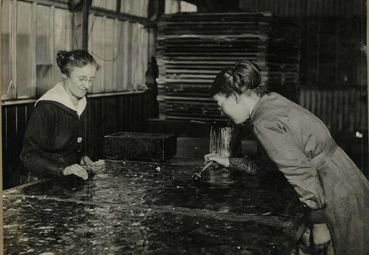 Keywords: ww1 firstworldwar war worlife1915 parsons munitions women female labourers work factory heaton newcastle industrial heritage industrialheritage black and white photograph blackandwhitephotograph 'women labourers' womenlabourers shields road shieldsroad production micante sheets micantesheets 1914 - 18 191418 women of the war womenofthewar charles parsons charlesparsons rachel parsons rachelparsons war effort wareffort parsons' works parsonsworks digital image digitalimage paint brush paintbrush dress crease hair glasses attentive standing table button blouse hand finger pile sheets wall wire scratch grain beam box wood painting blur workbench smile interesting black and white These images belong to the Parsons’ ‘Women Labourers’ photograph album, taken at Parsons’ Works on Shields Road during the First World War. (TWAM ref: 2402) The factory was founded by engineer Charles Parsons, best known for his invention of the steam turbine. In 1914, with the outbreak of war, Parsons’ daughter Rachel, one of the first three women to study engineering at Cambridge, replaced her brother on the board of directors, and took on a role in the training department of the Ministry of Munitions, supporting the increasing amount of women taking on jobs in industry to support the war effort. More information about Rachel Parsons and Parsons’ Works can be found in Great North Greats a guest post by David Wright. (copyright) We’re happy for you to share these digital images within the spirit of The Commons. Please cite 'Tyne & Wear Archives & Museums' when reusing. Certain restrictions on high quality reproductions and commercial use of the original physical version apply though; if you're unsure please email archives@twmuseums.org.uk These images belong to the Parsons’ ‘Women Labourers’ photograph album, taken at Parsons’ Works on Shields Road during the First World War. (TWAM ref: 2402) The factory was founded by engineer Charles Parsons, best known for his invention of the steam turbine. In 1914, with the outbreak of war, Parsons’ daughter Rachel, one of the first three women to study engineering at Cambridge, replaced her brother on the board of directors, and took on a role in the training department of the Ministry of Munitions, supporting the increasing amount of women taking on jobs in industry to support the war effort. More information about Rachel Parsons and Parsons’ Works can be found in Great North Greats a guest post by David Wright. (copyright) We’re happy for you to share these digital images within the spirit of The Commons. Please cite 'Tyne & Wear Archives & Museums' when reusing. Certain restrictions on high quality reproductions and commercial use of the original physical version apply though; if you're unsure please email archives@twmuseums.org.uk |