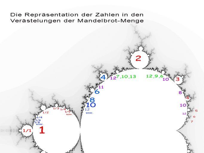Keywords: Mandelbrot-set mit Zahlen.png en Mandelbrotset with branching numbers de Grundfigur der Mandelbrot-Menge mit Verästelungszahlen own 2006-11 Steffen Rehm Mandelbrot set properties