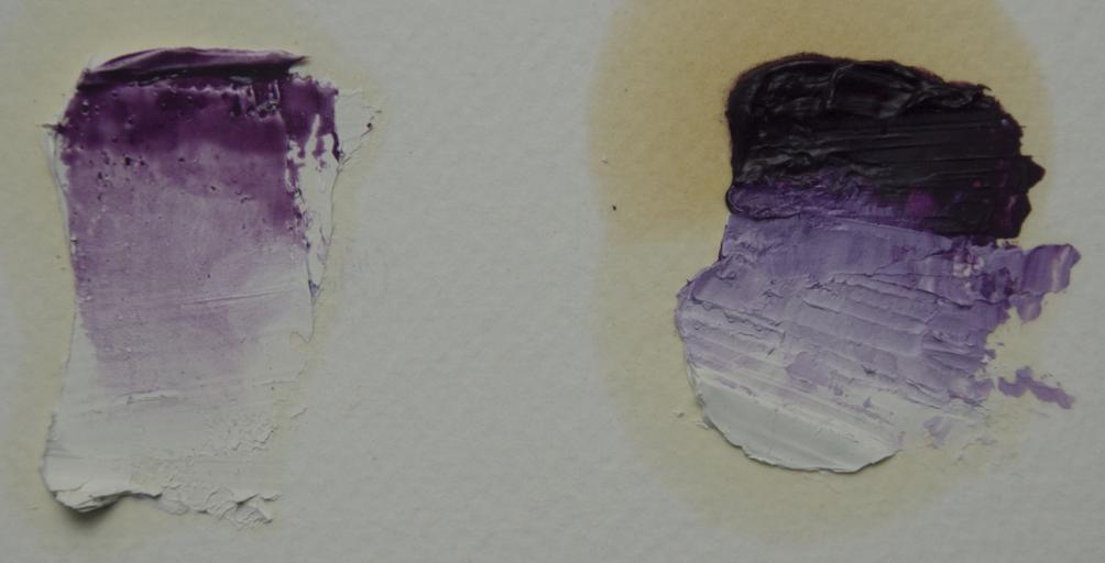 Keywords: Mangaanviolet.png en Manganese violet in oil a standoil glaze over zinc white on the left and a mass tone on the right 2016-11-15 own MWAK other versions cc-zero Manganese-oxygen compounds