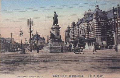 Keywords: Manseibashi Station Tokyo.jpg en Bronze Statue of Commander Hirose Takeo in Manseibashi Station in Tokyo ja 京名 萬世橋 車場と廣 中佐銅像 between 1912 1923 before 1945 <br/>Note Manseibashi Station was opened in 1912 as brick building however it was destroyed in 1923 by 1923 Great Kantō earthquake Great Kantō earthquake http //kokoronoiori cocolog-nifty com/blog/2010/09/post-e545 html こころの居間・ author PD-Japan-oldphoto Uploaded with UploadWizard Manseibashi Station History of Tokyo Postcards of Tokyo Statues in Tokyo Takeo Hirose Sugino Magoshichi 1912 in Akihabara Akihabara in the 1910s Akihabara in the 1920s 1923 in Akihabara |