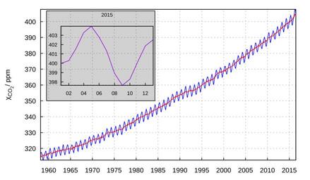 Keywords: Mauna Loa Carbon Dioxide.svg Stoffmengenanteil χ von CO<sub>2</sub> in trockener Luft in Mauna Loa selbst geplottet Daten ftp //aftp cmdl noaa gov/products/trends/co2/co2_mm_mlo txt StefanPohl <span class signature-talk ></span> 2014-08-30 see Template Other versions/Mauna Loa Carbon Dioxide v reset set encoding utf8 set term svg size 600 350 fname 'Arial Helvetica sans-serif' fsize 13 unset key set samples 1000 set grid set xdata time set timefmt ' Y m' set ylabel 'χ_ CO_2 / ppm' set format x ' Y' set tics nomirror scale 5 set xtics 60 60 24 365 25 5 unset mxtics set autoscale fix name 'co2_mm_mlo ' set output name 'svg' data name 'txt' set multiplot x1 15 y1 44 s1 35 s2 5 set object 1 rectangle from screen x1 y1 to screen x1+s1 y1+s2 back fc rgb 0xD0000000 plot data u 1 5 w l lc rgb 0x0000FF \ u 1 6 w l lc rgb 0xFF0000 unset object 1 unset grid set tmargin 2 set rmargin 5 set bmargin 2 set lmargin 4 set termoption font ' 10' set title '2015' set size s1 s2 set origin x1 y1 set format x ' m' unset ylabel set xtics 60 60 24 61 plot '2015 1' '2016 1' data u 1 5 w l unset multiplot unset output Cc-zero Keeling Curves Mauna Loa CO2 data |
