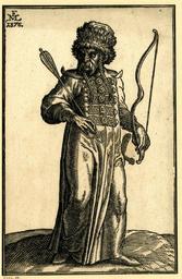 Keywords: Melchior Lorck - A Tartar archer.jpg en A Tartar archer; whole-length figure his head turned to left; holding a bow in his left hand and arrow in his right hand; the hilt of his sword visible next to his left hand; from a series of 127 woodcuts 1576 Woodcut 1576 http //www britishmuseum org/research/collection_online/collection_object_details aspx objectId 1449342 partId 1 searchText lorck page 1 creator Melchior Lorck other versions PD-old-70-1923 The Turkish Publication by Melchior Lorck |
