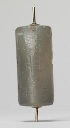 Keywords: Mesopotamian - Cylinder Seal with Archer and Winged Lion - Walters 421195 - Side A.jpg A worshiper faces a deity standing on a griffin and aiming his bow and arrow at an upright winged lion-demon The winged disk of Ashur the patron god of Assyria appears above The three-line inscription gives the name of the owner Assyrians enjoyed the translucent and vibrant colors of semiprecious stones such as chalcedony between 900 700 BC Neo-Assyrian carved chalcedony gold cm 6 6 2 1 h x diam accession number 42 1195 34654 Mrs Henry Walters New York Sale Joseph Brummer New York 1941 Walters Art Museum 1942 by purchase Museum purchase 1942 Inscription place of origin Mesopotamia Walters Art Museum license Cylinder seals in the Walters Art Museum Art of Mesopotamia in the Walters Art Museum Media contributed by the Walters Art Museum needs category review |