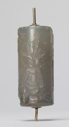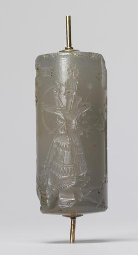 Keywords: Mesopotamian - Cylinder Seal with Archer and Winged Lion - Walters 421195 - Side D.jpg A worshiper faces a deity standing on a griffin and aiming his bow and arrow at an upright winged lion-demon The winged disk of Ashur the patron god of Assyria appears above The three-line inscription gives the name of the owner Assyrians enjoyed the translucent and vibrant colors of semiprecious stones such as chalcedony between 900 700 BC Neo-Assyrian carved chalcedony gold cm 6 6 2 1 h x diam accession number 42 1195 34654 Mrs Henry Walters New York Sale Joseph Brummer New York 1941 Walters Art Museum 1942 by purchase Museum purchase 1942 Inscription place of origin Mesopotamia Walters Art Museum license Cylinder seals in the Walters Art Museum Art of Mesopotamia in the Walters Art Museum Media contributed by the Walters Art Museum needs category review |