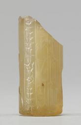 Keywords: Mesopotamian - Cylinder Seal with Human Headed Winged Bull and Inscription - Walters 42808 - Side A.jpg This scene on this seal depicts a human headed winged lion wearing a horned crown with an inverted crescent in the field above him The scene also incorporates a cuneiform inscription in three registers late 2nd millenium BC Neo-Babylonain ; Assyrian yellow transparent stone cm 2 4 0 9 accession number 42 808 4549 Sadie Jones Mrs Henry Walters New York date and mode of acquisition unknown Sale Joseph Brummer New York 1941 Walters Art Museum 1941 by purchase Museum purchase 1941 Inscription place of origin Mesopotamia Walters Art Museum license Cylinder seals in the Walters Art Museum Art of Mesopotamia in the Walters Art Museum Lions in art of the ancient Near East Cuneiform on cylinder seals Cuneiform on media Griffin cylinder seal Walters 42808 Walters Art Museum cylinder seals with cuneiform Animals in art of the ancient Near East An cuneiform Media contributed by the Walters Art Museum needs category review |