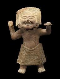 Keywords: Mexican - Female Ritual Performer - Walters 20092047.jpg South-central Veracruz was home to a number of vibrant sculptural traditions Among them is the so-called Nopiloa style named for the archaeological site of Nopiloa located in the Mixtequilla area of southern Veracruz Hundreds if not thousands of these striking figures were produced during the Late Classic Period ranging from small figures to large-scale sculptures most of which were made in press molds with some hand-modeling for adding accouterments of dress The figures may depict ritual performers or intended sacrificial victims in the midst of a trance induced by the ingestion of mind-altering substances such as hallucinogenic plants animal poisons or alcohol It has been suggested that these figures represent the Classic Period antecedents of the ritual practices of induced joviality and ecstatic dance in honor of the Postclassic deity Xochipilli-Macuilzochitl These Nopiloa figures typically are portrayed with upraised head and arms held at the side of the head Usually the right hand clutches an object that eludes identification although it has been variously suggested to be a rattle a potent native tobacco cigar or a hallucinogenic plant material AD 600-900 Late Classic earthenware cm 40 32 24 13 10 16 accession number 2009 20 47 80202 Economos Works of Art date and mode of acquisition unknown John G Bourne 1990s by purchase Walters Art Museum Gift of John Bourne 2009 place of origin southern Veracruz Mexico Walters Art Museum license Mexican Pre-Columbian art in the Walters Art Museum Media contributed by the Walters Art Museum needs category review Mexican - Ritual Performer - Walters Art Museum |