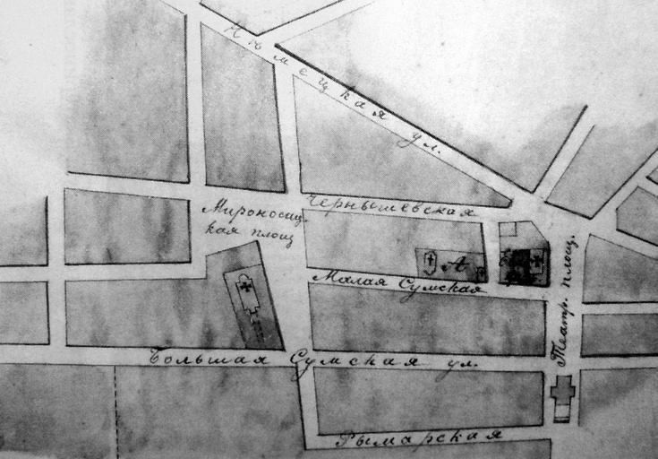 Keywords: Mironositska07.jpg en Fragment of old Kharkov map ru Ф агмент ка ты Ха ькова начала XX на кото ом обозначена и оносицкая це ковь А Ф Па амонов П авославные х амы Ха ьковской губе нии 1681-1917 гг Альбом-каталог - Ха ьков Ха ьковский частный музей го одской усадьбы ISBN 978-966-8246-73-9 author early XX century PD-old Mironositska church in Kharkiv |