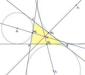 Keywords: Mittenpunkt.svg en Mittenpunkt in a triangle de Mittenpunkt M im Dreieck ABC Dieser liegt im Schnittpunkt der Verbindungen zwischen den Ankreismittelpunkten J und den jeweiligen Seitenmittelpunkten Ma Mb Mc own Oldracoon 2010-12-03 Cc-zero Special points in a triangle |